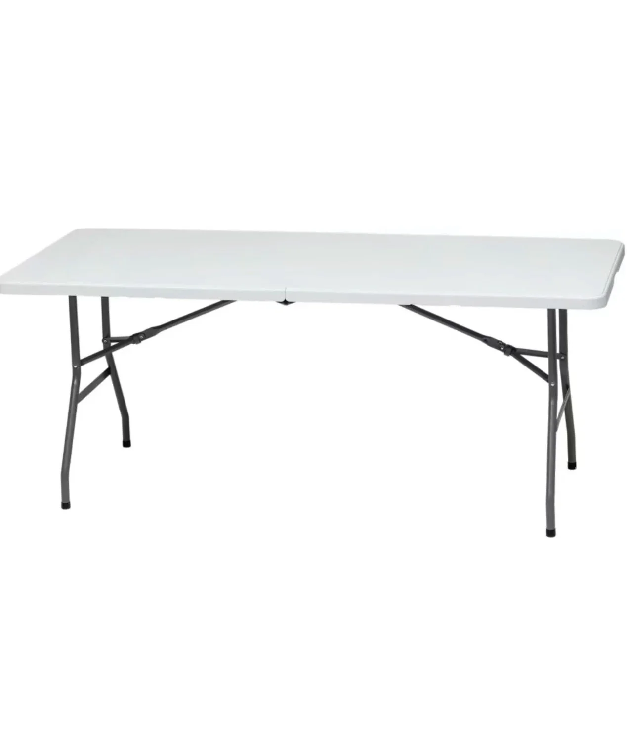 Clean, sturdy. White, plastic long tables. Seats 6-8 guests, 72” x 30".